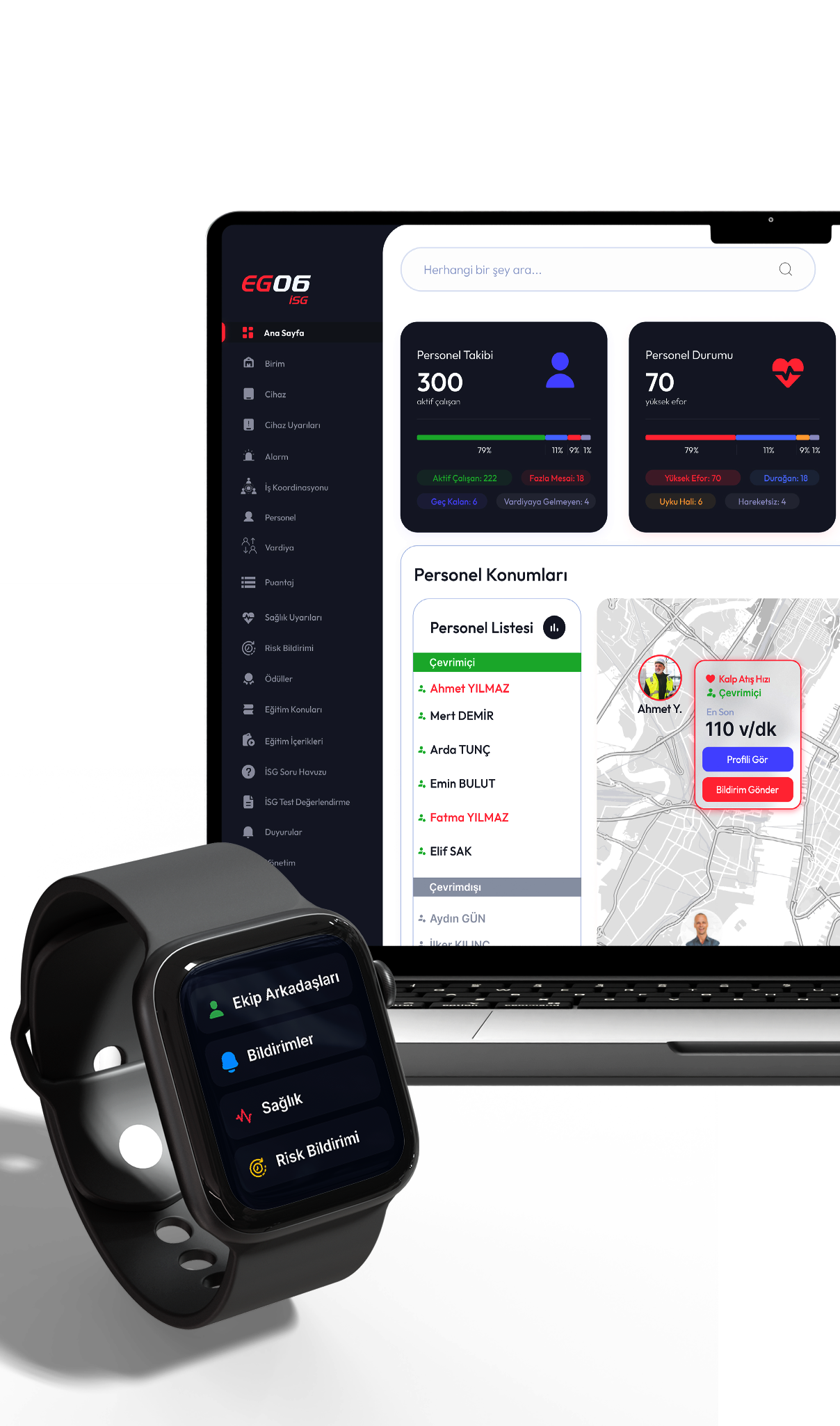 Akıllı saatler ile personelin anlık konum, sağlık verileri ve güvenlik durumunu izleyen dijital bir iş sağlığı ve güvenliği platformudur.