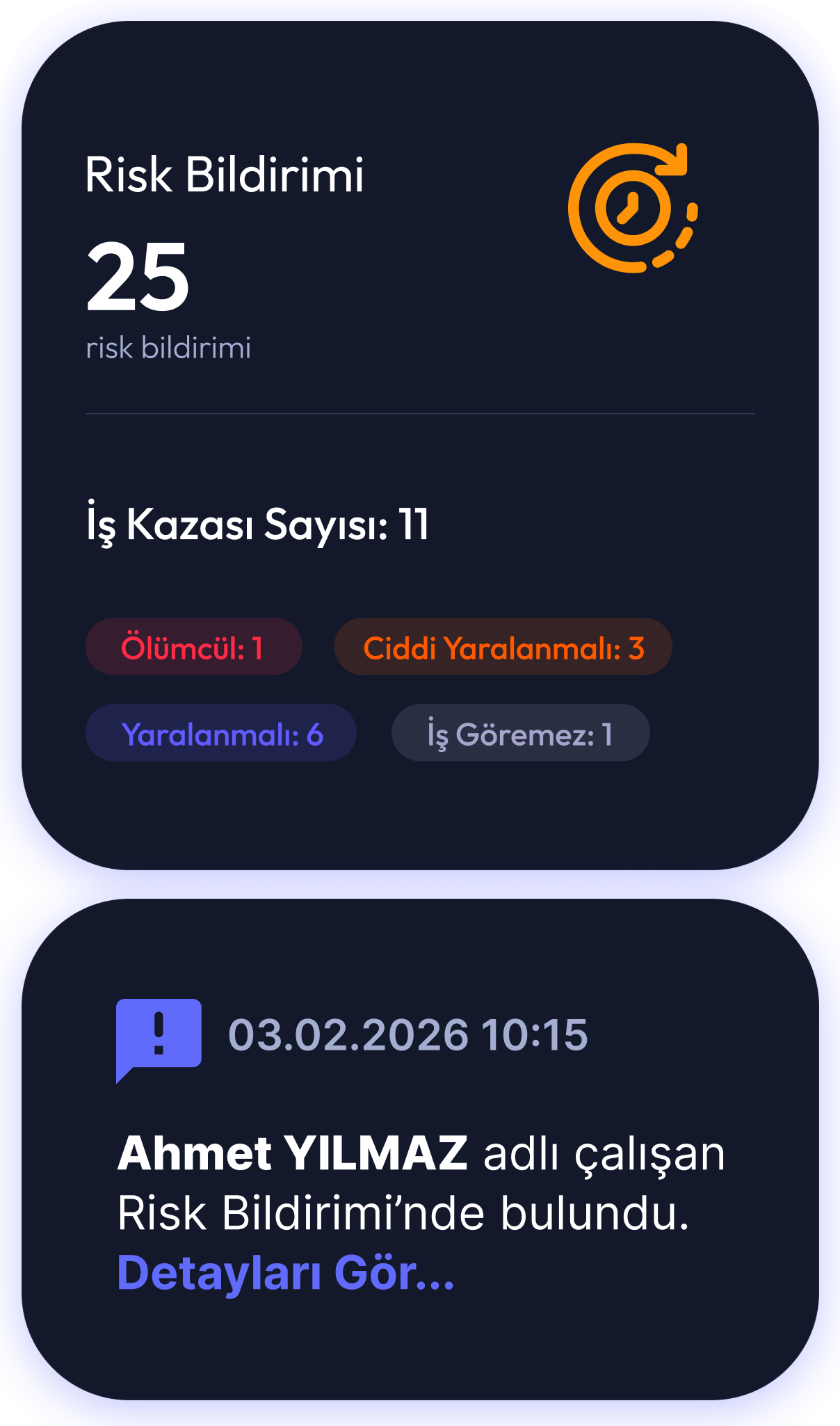 Akıllı saat entegrasyonu ve gerçek zamanlı veri analizi ile iş kazalarını gerçekleşmeden önleyin. Çalışan güvenliğini teknolojiyle koruma altına alın.